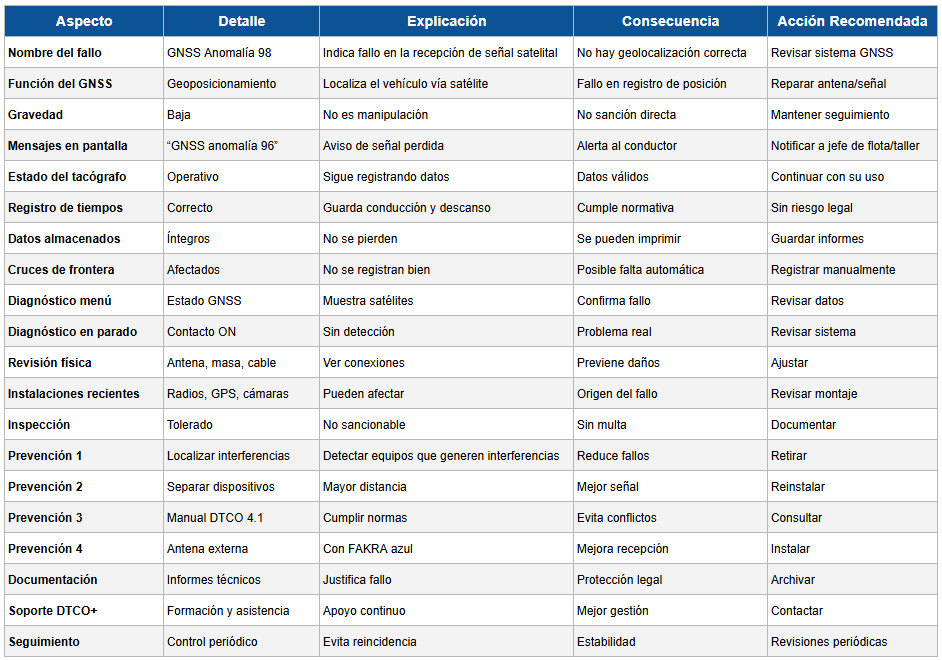 Durante la inspección de un vehículo con un tacógrafo donde aparece de forma reiterada el Fallo GNSS “Anomalía 96”, es importante tener en cuenta las siguientes consideraciones: